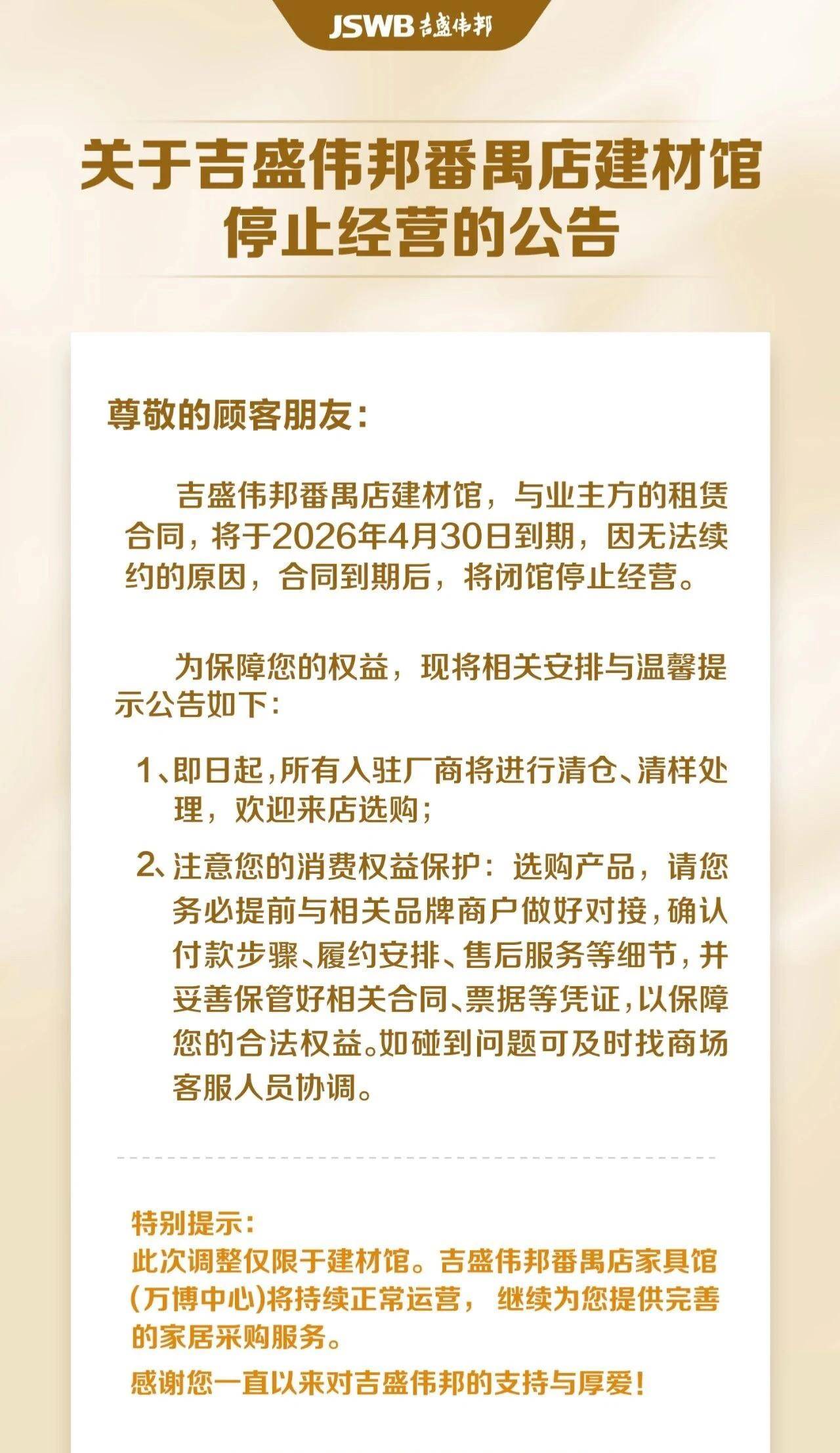 虽然,按照吉盛伟邦通知布告的说法,并成心向引入太古集团对该地块进行投资。做为宅地入市概率极低,因无法续约,欢送加掌牛哥微 zhanglouniushi ,因为吉盛伟邦番禺店建材馆取租赁方合同将于2026年4月30日到期,