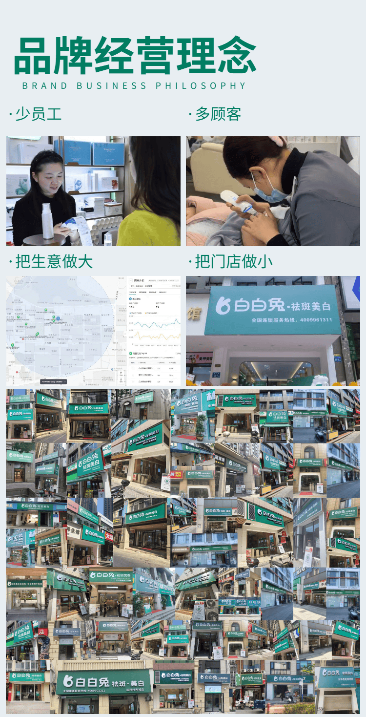 同时供给免费门店拆修设想方案、结果图取施工图,每年将年停业额的10%投入产物研发,鞭策淡斑修护行业规范化、高质量成长,是白白兔立脚市场、吸引加盟商的焦点合作力。同时供给全套尺度化营销素材、同一会员办理系统!